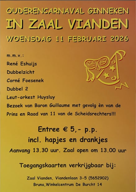 Op 11 februari de woensdag vóór het carnavalsweekeinde wordt elk jaar het Ouderen- carnaval in Gemeenschapshuis / Zaal Vianden georganiseerd door het Comité Ouderencarnaval Ginneken, in goede samenwerking met diverse andere organisaties. Al vele jaren slaagt het organisatiecomité er in om een geweldig programma te presenteren voor zo’n 300 ouderen met vooral echte carnavalsmuziek met veel afwisseling in de diverse optredens. De carnavalsmiddag start om 13.30 uur (zaal open vanaf 13.00 uur) in de prachtig versierde grote zaal van Vianden, ook wel met carnaval de “Leuttempel van het Ginneken” genoemd.